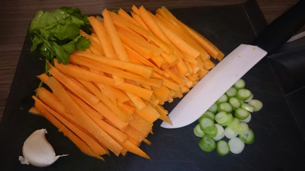 Dieses Mal geht die Vorbereitung sehr schnell: Frühlingszwiebeln putzen und in feine Ringe schneiden, Karotten schälen und zu Stifterln zerkleinern und das Schweinsfilet in dünne Streifen schneiden. Das Fleisch am besten mit Soja-Sauce, der Sweet-Chili-Sauce und der Gewürzmischung marinieren.